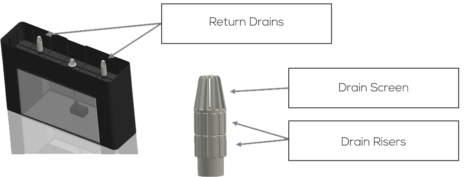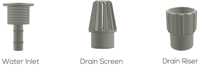 8. Insert 2 drain riser sections and a screen into each of the drain holes to the left and right of the water inlet inside of the grow-bed. This sets the depth the water level will reach before it drains back into the aquarium (otherwise known as the return drains).