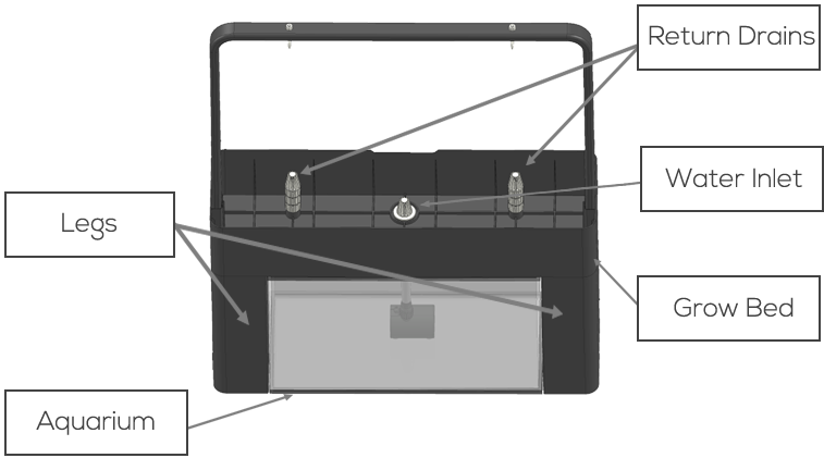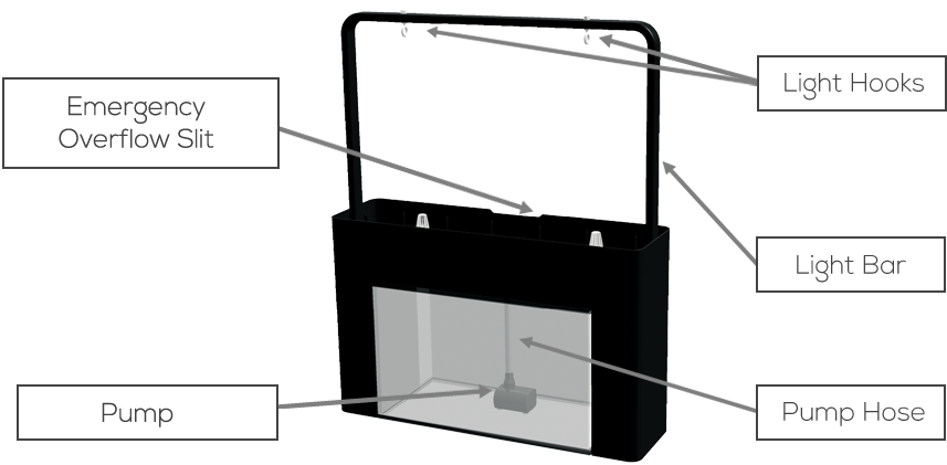 First off, unpack your AquaSprout Garden and make sure you have everything. It may help to lay the pieces out according to where you’ll use them. You should have: