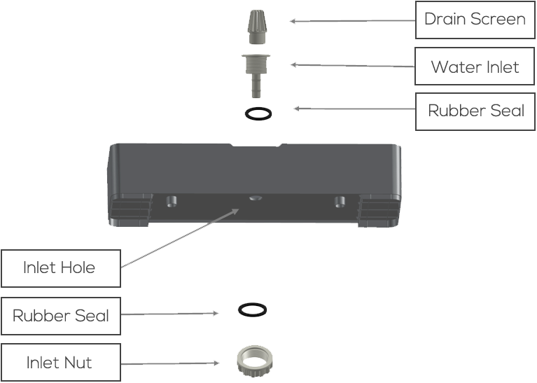3. Slip one of the rubber seals over the threaded section of the water inlet and insert the inlet into the hole in the center of the grow-bed with the threaded end and hose barb downward. Slip the other rubber seal over the threaded end of the water inlet, then thread on and tighten the plastic inlet nut, flat side upward. (Fig. below)